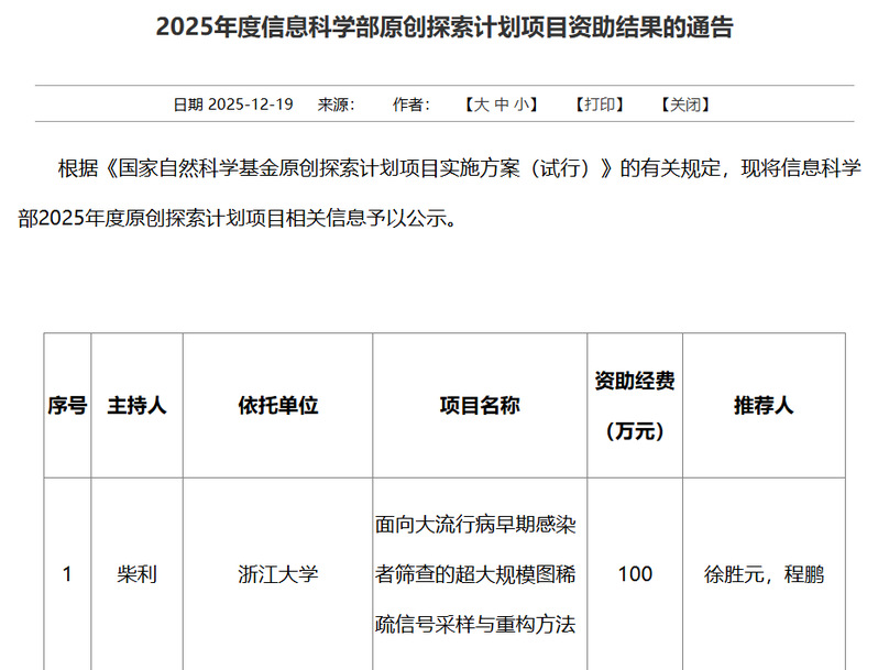 近日,国家自然科学基金委公布了2025年度“原创探索计划项目”获资助项目名单。浙江大学控制科学与工程学院柴利教授(实验室固定成员)牵头申报的“面向大流行病早期感染者筛查的超大规模图稀疏信号采样与重构方法”项目成功获批。这是学院继去年首次获批“原创探索计划项目”后,再度获得该计划支持,充分体现了学院在前沿科学探索与研究方向创新上的持续突破能力。